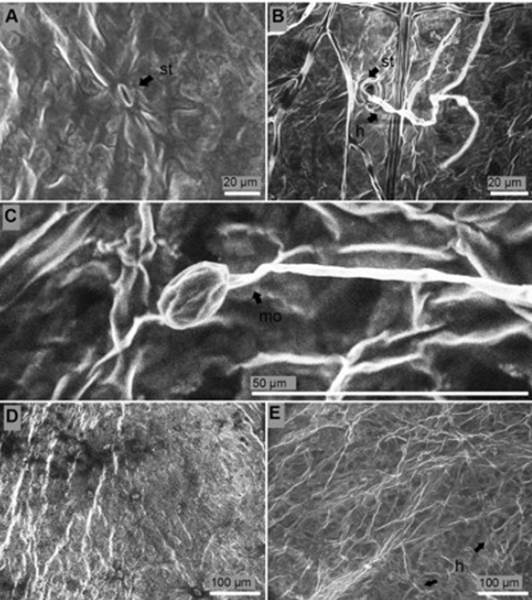 Figure 7 Surface of the leaves of P. edulis f. flavicarpa seedlings. (A) Stoma (st) of non-inoculated seedling. (B) Hyphae (h) colonized stomata (st) six days after inoculation. (C) Monophialide (mo) with micoconiadia in situ thirteen days after inoculation. (D) Healthy leaves. (E) Presence of hyphae (h) thirteen days after inoculation.