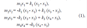 Se estudia en detalle la transmisión de energía en el sistema de osciladores acoplados sugerido por Herrmann & Schmalzle en su artículo (1981). El sistema de osciladores se considera como una cadena lineal de esferas con movimiento unidimensional, la cual sirve como medio de propagación de una deformación. El sistema se encuentra constituido por un conjunto de cuatro osciladores acoplados, con diferente masa (m) y diferente coeficiente de acoplamiento (k). Los resortes interactúan elásticamente con los osciladores y su estado de movimiento se representa en la figura 1.