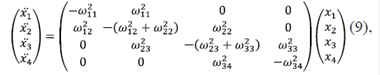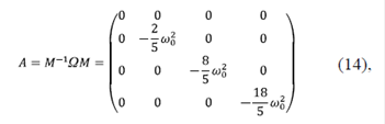 Los vectores propios de la matriz (A) son los vectores de la base estándar definidos anteriormente (|1>, |2>, |3>, |4>). Usando la matriz similar (A), las ecuaciones de movimiento se desacoplan fácilmente para obtener: