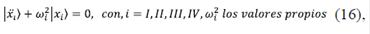 Los valores propios de la matriz (A) que se encuentran en la diagonal se identifican con las frecuencias normales de oscilación del sistema, es decir, existe una relación biunívoca entre el valor propio y la frecuencia normal de oscilación del sistema. La obtención del conjunto de vectores propios |I >, |II >, |III >, |IV >, permite desacoplar de manera sencilla las ecuaciones de movimiento, así como identificar cada vector propio con el modo normal de oscilación correspondiente a cada frecuencia normal de oscilación del sistema. Por último, la solución del sistema (16) tiene una simple dependencia temporal en forma de exponencial como la dada en (2).