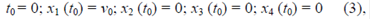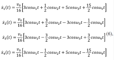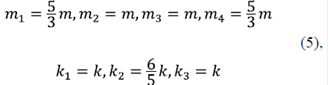 donde x 1, x 2, x 3, x 4, son los desplazamientos de las masas con respecto a su posición de equilibrio. La dinámica del sistema de osciladores se describe mediante la solución de las ecuaciones de movimiento (1) dada por Symon (1968) y Sposito (1976):