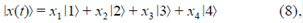 Los vectores |1>, |2>, |3>, |4> se toman como el conjunto de estados de base bien definidos para el análisis del comportamiento del sistema de osciladores. Además, el concepto de estado tiene un papel importante en el análisis, ya que permite hacer una descripción de la evolución temporal del sistema (Gillespie, 1991).