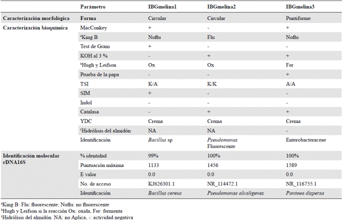 Se seleccionaron tres cepas de bacterias y se las caracterizó morfológica, cultural y bioquímicamente (Tabla 2), con lo cual se encontró que los tres aislamientos presentaban forma de bacilo, pertenecían a los géneros Bacillus y Pseudomonas, y que un aislamiento era de la familia Enterobacteriaceae.