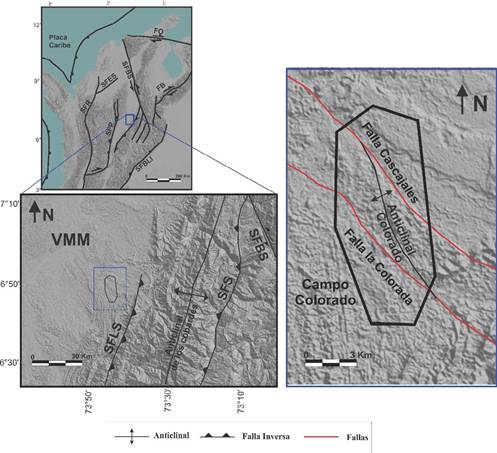 Geología estructural. El Valle Medio del Magdalena es una depresión tectónica asimétrica, limitada por dos frentes cabalgantes de vergencia opuesta, (Córdoba, et al., 2000). Está limitado al norte por el sistema de fallas de Espíritu Santo (S.F.E.S), al noreste, por el sistema de fallas de Bucaramanga-Santa Marta (S.F.B.S.M); al sureste, por el sistema de fallas de Bituima y La Salina (S.F.B.S), y al oeste, por la Serranía de San Lucas y la cordillera Central (Barrero, et al., 2007).