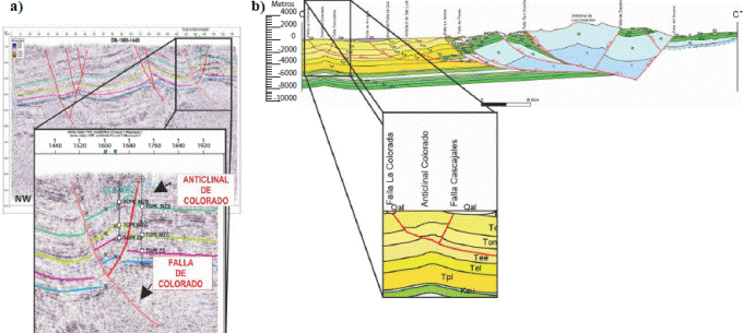 Modelos del Campo Escuela Colorado. Mediante la interpretación sísmica, Ecopetrol (2003) definió un modelo estructural para el Campo Escuela Colorado controlado por un sistema de fallas inversas paralelas que lo delimita y segmenta en cinco bloques. Por otro lado, con base en la reinterpretación de cuatro líneas sísmicas, Chajín, et al. (2013) propusieron un modelo estructural definido por fallas inversas con anticlinales y retrocabalgamientos asociados (Figura 2). Con base en información de superficie, Zafra (2013) propuso que el anticlinal de Colorado está afectado trasversalmente por fallas normales con componente de rumbo sinestral.