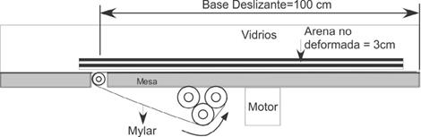 Experimentos, parámetros y materiales. La mesa de deformación utilizada para los experimentos consistió en una base deslizante de 100 cm, con dos paredes de vidrio (Figura 3). Los experimentos se desarrollaron bajo condiciones de gravedad normal. Se utilizó arena cuarzosa, seca, no cohesiva, con un coeficiente de fricción interna de 0,7 y una densidad promedio de 1,58 g/cm3. Se usó un papel mylar para simular el despegue basal horizontal cuyo coeficiente de fricción es despreciable (McClay, et al., 1999; Davis, et al., 1983). Con base en la ecuación (1) se determinó que el factor de escala era 10-5, donde 1 cm en el modelo equivale a 1 km en la naturaleza.