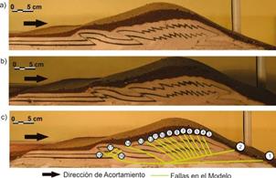 En el análisis de la cuña bivergente establecida en los modelos se puede observar el crecimiento de las fallas de cabalgamiento principales en el frente de la deformación (con vergencia hacia el promontorio) y una serie de retrocabalgamientos en el flanco trasero de la cuña. Las estructuras hacia el frente de la cuña crecieron con dos fallas inversas principales espaciadas cada 10 cm aproximadamente, definiendo una geometría de cuenca de promontorio (Figura 4). Las fallas de acomodación o retrocabalgamientos en los modelos se asociaron únicamente con la segunda falla principal (Figuras 4 y 5). Esta estructuración se localizó en las zonas más distales de la cuña y se evidenció por la doble vergencia de las fallas que se definen en un despliegue pop up (Figura 5).