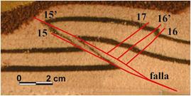 En la Figura 4 se muestran diferentes cortes trasversales en la prueba n°15, en la que se resaltan las fallas generadas en la cuña bivergente. Estas fallas se enumeraron (Figura 4c) según el orden cronológico de crecimiento.