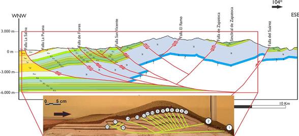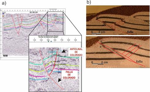 Figura 7 Comparación entre: a) el modelo estructural del Campo Escuela Colorado de Chajín, et al. (2013) y b) el resultado de los experimentos realizados. a) Modelo estructural definido por la falla de Colorado con vergencia inversa hacia el oeste y su anticlinal y retrocabalgamiento asociados. Interpretación de la línea sísmica DM-1989-1440. b) Corte transversal del modelo a escala de laboratorio en el que se muestra una falla principal con vergencia al promontorio y retrocabalgamientos asociados