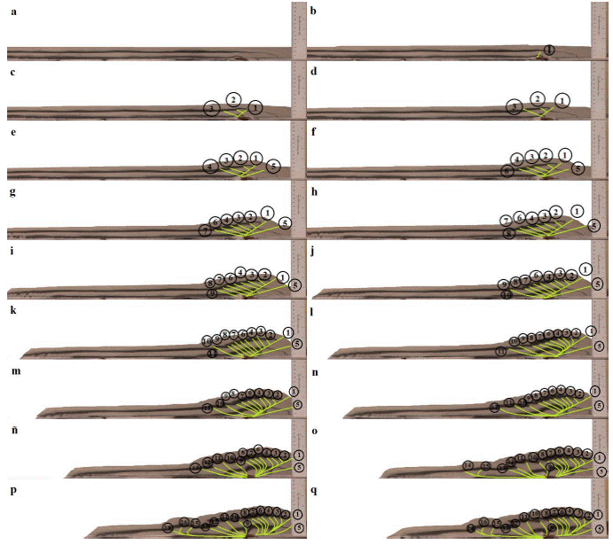 Con el fin de garantizar estadísticamente la reproducibilidad de los experimentos se hicieron 15 pruebas experimentales de cuñas bivergentes con longitudes iniciales (Xo) máximas de 92 cm y longitudes mínimas de 80 cm (Tabla 1), y longitudes finales (X) máximas de 78 cm* y mínimas de 57 cm. Los resultados de los 15 experimentos (Tabla 1, Figura 4) evidenciaron una tendencia en sus estructuras y geometrías repetibles y similares a la de los experimentos reportados en trabajos previos (Malavieille, 1984; Liu, et al., 1992; Biggi, et al., 2010). En el análisis de evolución del modelo, se registraron los datos de longitud (Xo) y altura (Yo) iniciales y finales(x, y), con el fin de calcular el porcentaje de acortamiento. En promedio, para los experimentos este fue de 26 % (22 cm) (Tabla 1). Los experimentos mostraron un rápido crecimiento de la zona axial de la cuña debido al apilamiento de material asociado a las estructuras de la retrocuña (Figura 1S, https://www.raccefyn.co/index.php/raccefyn/article/downloadSuppFile/673/2766) (Tabla 1).