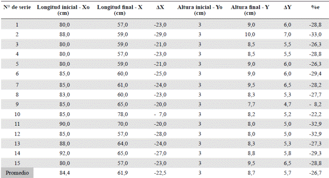 Tabla 1 Condiciones iniciales (Xo) y finales (X) para el cálculo del porcentaje de elongación (%e) de los modelos realizados.
