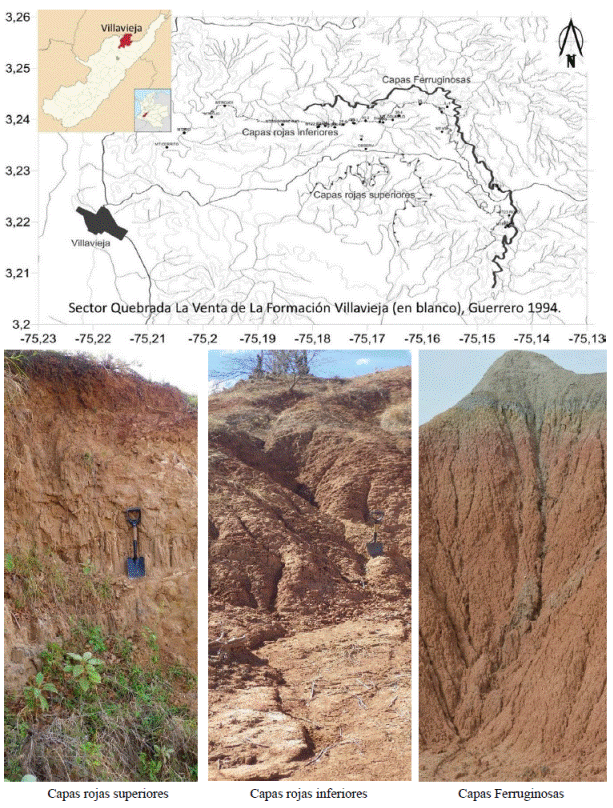 Parra (2016) hizo una comparación litoestratigráfica de las propuestas de Henao (1950), Fields (1959) y Guerrero (1994) y concluyó que el Grupo La Venta, Formación Villavieja, donde se encuentran las capas rojas, era una secuencia de sedimentos continentales de origen fluvial que se conformaron como un monoclinal suavemente buzante hacia el sureste (SE). Localmente, en distancias cortas, el monoclinal se vuelve casi horizontal simulando anticlinales y sinclinales poco conspicuos tal como se presenta en la Tabla 1. Se han preservado los nombres locales y tradicionales para las unidades. Este autor solo estableció la existencia de paleosuelos en la capa roja superior (Tabla 1).