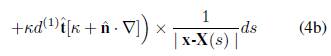 Donde κ y τ son la curvatura y la torsión a lo largo de la línea central, κ