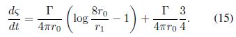 La expresión (15) resalta como el primer término a la derecha resulta ser la contribución a la traslación debida al efecto puramanete monopolar (equivalente al resultado de Thomson 1883). Donde se considera el promedio de la vorticidad en la sección transversal del vórtice concentrada a lo largo de su línea central.