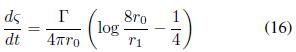 la derivada de la curvatura del vórtice respecto a la longitud de arco, Г es la circulación y