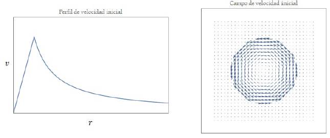 Figura 2 Perfil de velocidad inicial a orden cero (panel izquierdo). Representación vectorial del perfil de velocidad, a orden cero, de una sección transversal del vórtice anular (panel derecho).