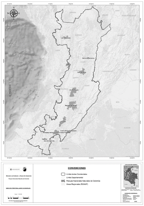 Area de estudio. La Dirección Territorial Andes Occidentales de Colombia abarca un área de 15.844.104 hectáreas distribuidas en 188 ecosistemas que van desde zonas arenosas y ríos hasta bosques de páramo pluvial en orobiomas diferenciados para cada vertiente de las cordilleras, zonas nivales y afloramientos rocosos (Ríos-Franco & Valencia, 2014). Este paisaje conserva cerca de 6,67 millones de hectáreas (42 %) de bosques y áreas seminaturales, mientras que los territorios agrícolas ocupan alrededor de 8,88 millones de hectáreas (56 %). Aproximadamente 200.000 hectáreas son áreas húmedas y superficies de agua naturales y artificiales. El uso del suelo está principalmente asociado a ganadería extensiva (pastos), cultivos de café, caña de azúcar y arroz, y cerca de 600 centros urbanos que demandan los servicios ecosistémicos de las áreas de conservación (Figura 1).