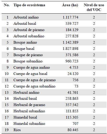 Tabla 1 Ecosistemas naturales remanentes de la territorial Andes Occidentales y el nivel de representación del VOC para cada tipo de hábitat según los criterios de selección.