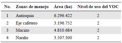 Tabla 2 Zonas de manejo de la Territorial Andes occidentales y el nivel de representación del VOC para cada una según los criterios de selección.