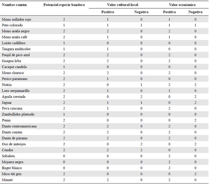 Parámetros de selección. Para determinar la importancia socioeconómica de cada especie candidata en el paisaje, se consideró si tenía un valor económico positivo o negativo y un valor cultural positivo o negativo (una misma especie en el paisaje puede tener valores culturares y económicos tanto positivos como negativos). Además, se consideró su potencial como especie emblemática o bandera.