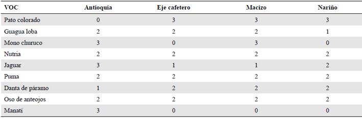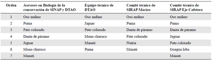 En cuatro ejercicios iterativos llevados a cabo por el equipo técnico de la Dirección Territorial Andes Occidentales (DTAO) y en algunos subsistemas temáticos se seleccionaron como valores objeto de conservación el oso, el puma, el pato colorado y el manatí, siendo el oso el primero en todos los resultados. La danta de páramo y el jaguar se seleccionaron en tres de los cuatro ejercicios. Además, el mono churuco se seleccionó en dos análisis, en tanto que la nutria y la guagua loba se seleccionaron cada uno en una de las iteraciones (Tabla 4).