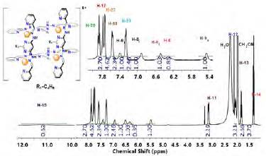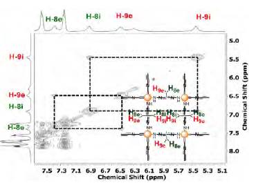NMR spectroscopy was used to follow the changes and shifts in the signals of the organic components of the complex. Figure 2 shows the 1H-NMR spectrum of the grid compound [Zn4(3)4](BF4)8. The signals in the high field did not present much change in comparison with the uncomplexed ligand 3. This similarity could be an indication of the position of the aliphatic chains outside of the grid structure. On the other hand, the analysis of the aromatic region of the spectrum shows four new signals at 5.47, 6.47, 6.89, and 7.45 ppm. To fully understand the nature of these new signals, a bidimensional COSY NMR experiment was carried out (Figure 3) showing a correlation between the signals at 6.89 - 5.47 ppm and at 6.45 - 7.45 ppm. Such correlations (Figure 2) correspond to the protons of the phenyl group in position 2 of the pyrimidine ring.