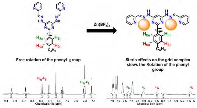 In the free ligand, the phenyl ring rotates freely around the pyrimidine-phenyl single bond axis (Figure 4). This rotation creates a similar chemical environment for the protons closer to the pyrimidine H8e and H8i. Similar behavior was observed for the protons in the ortho position to the aliphatic chain H-9e and H9i. As a result of this rotation, the 1H-NMR of the free ligand show two signals, a doublet and a multiplet, that integrate each of them for two protons. On other hand, in the grid complex, the phenyl ring of the bis(hydrazone) ligands inserts itself between two ligands (Figure 3) parallel to the coordination pocket. The position of the phenyl ring inside the compact grid structure creates a steric hindrance that limits the rotation around the phenyl-pyrimidine bond. This behavior results first in the shielding of the inside protons of the phenyl ring shifting the signals up to 5.43 ppm and finally results in the non-equivalence of the phenyl protons (Rojo, et al., 1999). Phenyl substituents in the position 2 of the pyrimidine ring are amongst the most used in the construction of grid complexes. Their presence allow several π- π interactions that stabilize the structure (Dutta, et al., 2011)