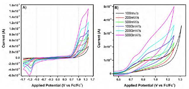 Figure 8 Cyclic voltammograms at different scan rates of the reduction processes in the free ligand 3. A) First two reduction events. B) Full cathodic curve