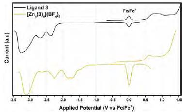 On the other hand, the OSWV showed three reduction events for [(Zn4(3)4](BF4)8 and the free ligand 3. Particularly, the cathodic CV of the grid complex showed two reduction events at -2.5 V and -3.0 V; as can be seen in the OSWV(Figure 5), the first event in the CV was composed of two separated reductions at -1.7 and 2.25 V The three reduction waves present in the grid complex are anodically shifted compared to the ones of the free ligand, an indication that the reduction processes are favored by the presence of the metal cation (Zn2+), even if the metal used was not electrochemically active in the window of our experiments. The presence of the positive charged ions and the highly conjugated systems of the bis(hydrazone) ligands could add more stabilization to the electrons added to the molecule. It is interesting that the grid complex did not present the reduction events on the anodic curve and the oxidation events on the cathodic curve that can be seen on the free ligand. Their absence could be an indication that the mechanism of the transfer process changes from the free ligand to the grid complex.