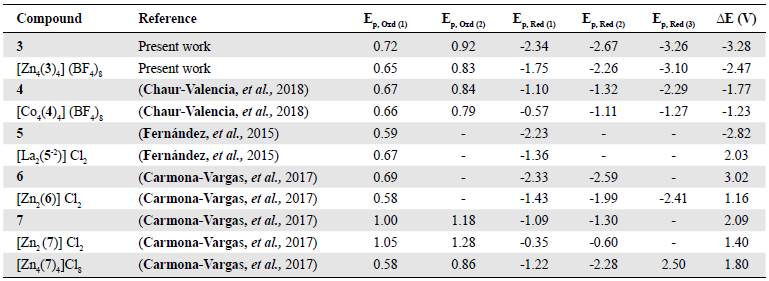 It is evident that metal complexation also has an influence on the electrochemical properties of these bis(hydrazone) compounds. In all cases, complexes exhibit reduction potentials anodically shifted when compared with the free ligands. The magnitude of the shift is dependent on the nature of the metal cation. For instance, electrochemically active cations like Co2+ and Fe2+ present lesser negative potentials than the complexes of electrochemically inactive cations like Zn2+ (Uppadine, et al., 2005). Electrochemical band gaps are also affected by the interaction between the ligand and the different metal cations. In fact, complexes exhibit smaller band gaps than the free bis(hydrazone).