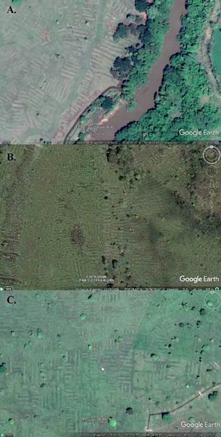 Figura 2A Patrón de camellones en caño. Imagen tomada el 2 de abril de 2018. B. Patrón escalonado. Imagen tomada el 04 de febrero de 2019. C. Patrón ajedrezado. Imagen tomada el 20 de septiembre de 2018