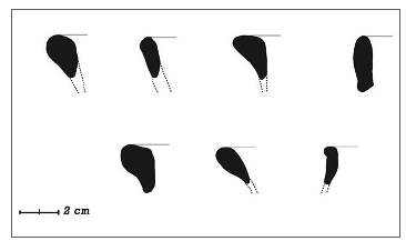 La cerámica de este sitio guarda estrechas similitudes con la del sitio El Recreo ya mencionado, aunque claramente exhibe una mayor diversidad de formas y tamaños. La presencia de grandes fragmentos cerámicos correspondientes a segmentos de cuerpo, con espesores mayores a un centímetro y con bordes de diámetro aproximado de 20 cm, plantean la existencia de ollas globulares o subglobulares de considerables dimensiones. Algunos bordes son evertidos, y de labio redondeado o biselado como los de El Recreo. Los de labio biselado en Toribio, a diferencia de aquel otro sitio, no son reforzados sino adelgazados y pueden prolongarse horizontalmente hasta 1,5 cm (Figura 7). Algunos bordes exhiben decoración acanalada en líneas paralelas horizontales, ya sea en la superficie interna o externa. Otro artefacto de diagnóstico registrado en este sitio fue un posible fragmento de asa de sección cuadrada y con curvatura abierta, muy distinto a las asas típicas de la alfarería prehispánica de Urabá.