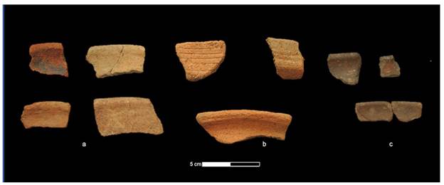 Los colores de la pasta son predominantemente naranja con núcleos de cocción internos grises o habanos. La pasta es de estructura porosa, a veces laminar, con desgrasante fino de roca triturada y algunas inclusiones de cuarzo y óxidos de hierro que ocupan un 5 % de la pasta. Si bien las superficies están muy erosionadas, la presencia de restos de engobe y decoración en algunos fragmentos sugiere que las vasijas tenían acabados más elaborados que no resistieron los procesos posteriores a su deposición. Las pocas decoraciones registradas, aparte de las ya mencionadas en el borde, constan de líneas incisas poco profundas y acanaladuras impresas paralelamente sobre segmentos del cuello. Sobresalen en el conjunto cerámico algunos fragmentos con pasta y desgrasante más finos, con espesores de 5 mm en promedio y color de pasta y engobe marrón (Figura 4, conjunto c).