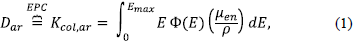 Para un mismo medio material, bajo la condición de equilibrio de partículas cargadas (EPC), la dosis absorbida es equivalente al kerma colisional (Attix, 2008; Ma, 2014). Por tanto, si el medio material es el aire, se tiene que (Bos, 2011),