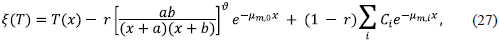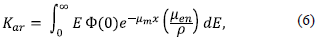 Si r es la fracción de kerma en aire debida a la radiación de frenado en el espectro no atenuado, consecuentemente 1 - r será la fracción de kerma en aire debida a la radiación característica. Con esto, los términos TF (x) y Te (x) son dados por,