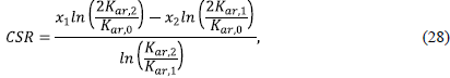 donde K ar0 , K ar1 , y K ar2 , son los valores de kerma en aire medidos con la cámara de ionización sin material absorbedor (x 0 ) y para valores de espesor del material absorbedor de x1 (medida experimental del espesor inmediatamente menor a la CSR obtenida por la curva de transmisión) y x 2 (medida experimental del espesor inmediatamente mayor a la CSR obtenida por la curva de transmisión), respectivamente (Santos, et al., 2016).