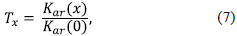 La transmisión relativa del haz a través del material absorbedor de espesor, T(x), se define como la razón entre el kerma total del haz atenuado en aire, Kar (x), y el kerma total del haz no atenuado en aire, Kar (0),