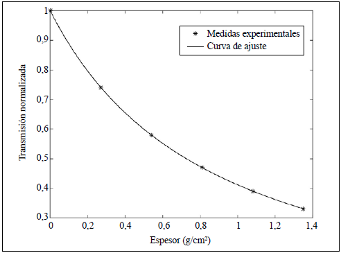 Resumiendo: la primera lectura, al no tener placa de aluminio (x = 0 mm), se correspondería con T(0); la segunda, para x = 1 mm (1 placa), con T(1); la tercera, para x = 2*1 mm = 2 mm (2 placas), con T(2); la cuarta, para x = 3*1mm = 3 mm (3 placas), con T(3) y así sucesivamente hasta llegar a x = 5 mm, con T(5). Luego, la curva T(x) se expresa en función de x, con x = 1,2, ...,5 mm. Como regularmente el espesor es indicado en términos de la densidad del absorbedor, x se convierte en x = px.