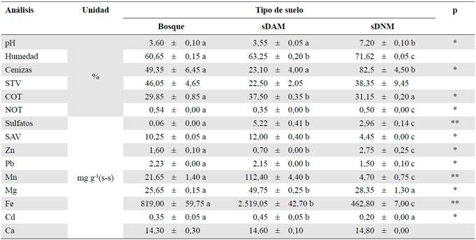 En el laboratorio se analizaron las muestras de suelo (sDAM, sDNM y del bosque) y se encontraron diferencias significativas (ANOVA, p≤0,05) en la mayoría de sus propiedades fisicoquímicas, con excepción de los STV, el Ca y la humedad (Tabla 1). El análisis de Pearson evidenció una correlación positiva de las cenizas con los metales (Zn 0,987; Pb 0,974; Mn 0,955; Fe 0,931, y Cd 0,972; p=0,01) y negativa con el COT (- 0,979; p=0,01), y, además, una correlación positiva de los metales Zn, Mn y Pb con los SAV (0,923, 0,894,0,840; p<0,05 respectivamente), en tanto que el sulfato se correlacionó de manera negativa con el pH y el NOT (- 7,40 y - 0,880; p<0,05, respectivamente), el Fe mostró una correlación positiva con el Mn, el Pb y el Cd (0,982, 0,995,0,832; p=0,01, respectivamente) y negativa con el Zn y el NOT (- 0,951 y - 0, 887; p=0,01, respectivamente). Se observó, asimismo, una correlación positiva entre el COT y el NOT (0,984 y 0,835; p<0,05).
