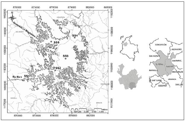 El Peñol-Guatapé reservoir is located at 1887.5 masl in the eastern Antioquia-Colombia (6°13'20"N - 75°10'11"W) within the jurisdiction of El Peñol, Guatapé and, San Rafael municipalities (Figure 1). At its maximum height, it has an area of 6253.6 has, a capacity of 1.240 million m3, maximum deep of 52 m, and an average residence time of 82 days (Bedoya-Cardona, 2017). Its main tributary is the Nare River, which contributes an average annual flow of 51.8 m3/s. It is mainly used for hydroelectric generation, tourism, and artisanal fishing. Its catchment area has been subjected to industrial, agricultural, livestock, and mining developments resulting in the deterioration of the quality of water (Cuéllar-Márquez, 2009).