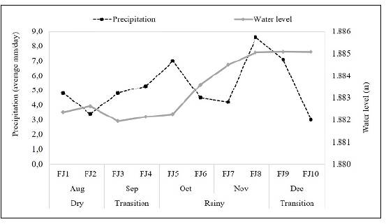 Nare River flow (inflow) was higher during the rainy season in September, October, and November and lower in the dry season (August) and during the transition to the dry one (December). Outflow was higher during the transition to the rainy season (September) and the rainy season in October and November, and lower in the transition to the dry season (December). At the end of November, almost when we were finishing the study, the water level had increased 5 meters approximately (Figure 2). Consequently, with the variations of inflow and outflow, residence time was higher in December.