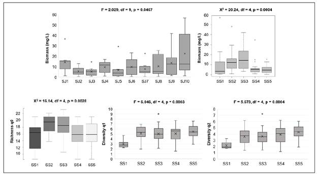 Figure 3 Phytoplankton biomass and diversity. Boxplots showing phytoplankton biomass, richness (q0), and diversity (q1 and q2) during 10 sampling journeys at five sites, SS1, SS2, SS3, SS4 and SS5, in El Peñol-Guatapé Reservoir (August to December 2014)