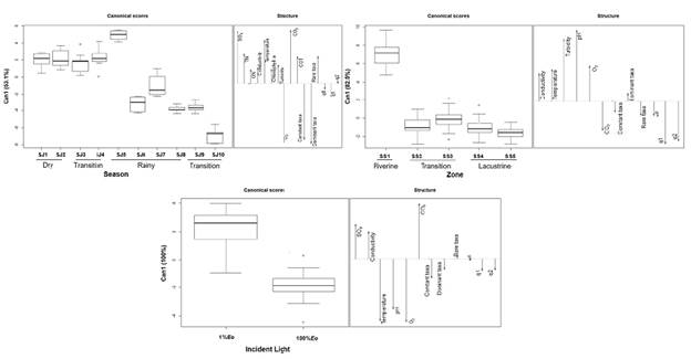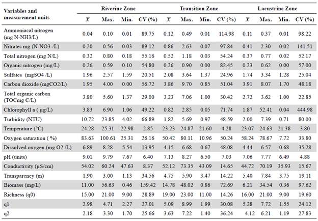 =17). ANOVA showed statistically significant differences among sampling sites because it was higher in the transition zone while it was lower in the lacustrine one (Figure 3). Considering common taxa and their contribution to biomass for estimating diversity of order 1, q1 exhibited significant differences among sampling sites (Figure 3) because the transition and lacustrine zones had a diversity mean value equal to that of a virtual community of 5.18 taxa with the same biomass. It is possible to say that transition and lacustrine zones were 1.73 times more diverse than the riverine zone considering mean values. Regarding the diversity of order 2 (q2), again the riverine zone was the less diverse sampling site (Figure 3). The ratio of the depth of the euphotic zone (Zeu)/mix zone, (Zmix)) exhibited a mean value >1 except in one case suggesting that organisms are active in a zone where light is available for phytoplankton growth. Table 2 shows the minimum and maximum values, the arithmetic mean, and the standard deviation of variables used in the discriminant analysis. Water temperature did not register important fluctuations (CV=4.2%) with values ranging from 21.4 to 25.3°C and a mean value of 23.3°C. At the vertical scale, dissolved oxygen concentration had a CV=41.5% with mean values of 2.9 mg/L at 1% Eo and 5.9 mg/L at 100% Eo. Among sampling sites, the highest concentration occurred at the riverine zone with most values over or close to 6 mg/L. CO2 concentration showed a vertical pattern inverse to that of dissolved oxygen with the highest concentrations at 1% Eo (5.1 mg/L) and the lowest at 100% (2.5 mg/L) while at the spatial and temporal scales, concentrations were very fluctuating (CV=52.8%). Electric conductivity varied between 35.9 and 75.3 μS/cm with a mean value of 49.1±8.04 μS/cm and a slight variation (CV=16.4%). At the spatial scale, the riverine zone showed the highest values for this variable (mean value: 54 μS/cm). pH ranged between 6.5 and 9.8 units with a mean value of 7.3 and little variation (CV=10.3%) with the highest values in the riverine zone where the media value was over 9 units. At the vertical scale, pH was higher at 100% (7.7 units of pH). Total nitrogen concentration varied between 0,02 and 1,18 mg/L with a mean value of 0,43 ± 0,25 mg/L and high variation (CV=57,25%). According to the Kruskal-Wallis test, dissolved oxygen concentration, pH, and electric conductivity showed significant differences at the spatial scale (p<0.05). Except for conductivity, the other variables registered significant differences at the vertical scale. These variables showed no difference between sampling journeys except for total nitrogen that was different in all the evaluated factors. TSI values were in all cases lower than 1 °C/m indicating thermocline did not occur and, consequently, there was vertical homogeneity.