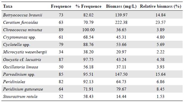 At the temporal scale, the results also partially supported the hypothesis given that, although during the study period the phytoplankton biomass did not present a pattern associated with precipitation or water level, it did show differential responses in the longitudinal gradient. Phytoplankton diversity did not show strong variation among sampling periods probably because nutrient inputs are constant in the reservoir as is the temperature. Additionally, the residence time was generally high and the phytoplankton community was formed by organisms characterized by effective responses to environmental conditions in the system, such as Botryococcus braunii, Ceratium furcoides, Chroococcus minutus, Cryptomonas sp2 and Parvodinium sp.