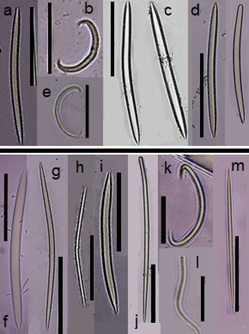 Figura 3 a-b) Haliclona caerulea: a) oxea (escala 100 μm); b) sigma (escala: 20 μm); c) oxeas de Amphimedon viridis (escala: 100 μm); d-e) Niphates erecta; d) oxeas (escala: 100 μm); e) sigma (escala 20 μm); f-g) Neopetrosia carbonaria: f) oxea i (escala: 100 μm); g) oxea ii (oxea 100 μm); h) centrostilote (escala: 30 μm); i) oxea de Neopetrosia proxima (escala: 100 μm); j-m) Biemna caribea; j) estilo (escala: 100 μm); k) sigma (escala: 20 μm); l) comma (escala: 20 μm); m) oxea (escala 50 μm)