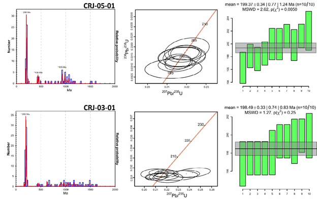 Los circones seleccionados para la interpretación de la edad magmática tenían relaciones Th/U de entre 0,4 y 2,5, características de una procedencia magmática (Rubatto, 2002), así como morfologías prismáticas con bordes bien definidos. Los resultados de las muestras CRJ-05-01 y CRJ-03-01 se graficaron en el diagrama de concordia de Wetherill (las elipses de error son graficadas a ±2o) y se calculó una edad media ponderada de 199,37± 0,34 Ma y 198,49± 0,33 Ma, respectivamente, interpretadas como la edad de la actividad magmática coetánea a la sedimentación de la formación Jordán (Figura 3).