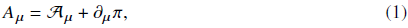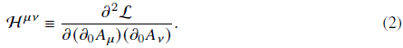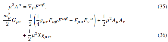 con Aμ, siendo la parte sin divergencia y ϖ, siendo un campo escalar que se identifica con el grado de libertad longitudinal asociado a . Aμ. Entonces, si se desea que las ecuaciones de campo, tanto para Aμ como para su componente longitudinal ϖ no sean de orden superior a dos, con el fin de evitar la inestabilidad de Ostrogradski (Ostrogradski, M., 1850; Woodard, R. P., 2007; Woodard, R. P, 2015), la acción del campo vectorial puede incluir, únicamente, al campo mismo y a sus primeras derivadas espaciotemporales ∂ μ A V (Rodríguez, Y., & Navarro, A., 2017).