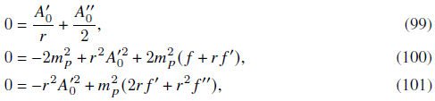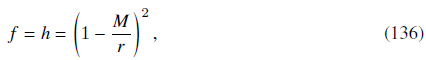 con M = -PQ/(2Xc). En el límite asíntotico cuando r →∞, se debe tener que f = h = 1, lo cual indica que C = 1. De otra parte, se tiene que las ecuaciones de campo gravitacional de componentes (μ, v) = (0,0), (μ, v) = (1,1) y (μ, v) = (2,2) son, respectivamente,