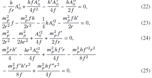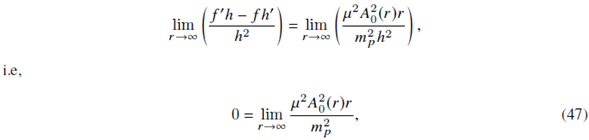 por lo tanto, si r → r h , el lado izquierdo de la ecuación (45) tiende a un valor finito en tal límite. Asimismo, al analizar el comportamiento del lado derecho, se requiere que A° tienda a cero con el fin de que la expresión sea consistente. De otra parte, considerando el comportamiento asintótico para r →∞, se sabe que en este límite f = h = 1. De esta manera, el límite de la expresión (44) conduce a