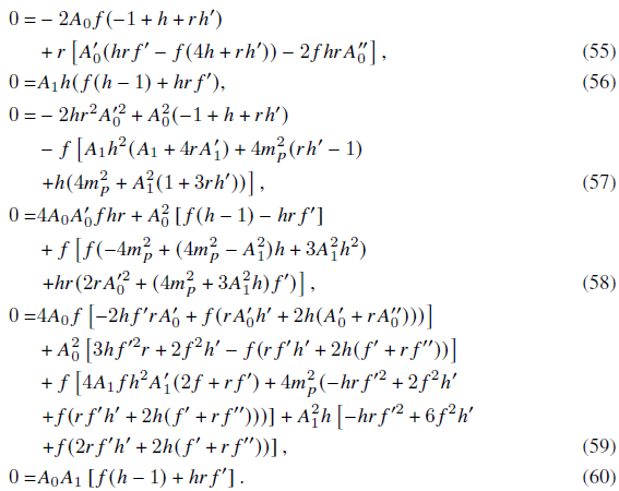 En primer lugar, la ecuación (60) admite una solución en donde A 0 = 0 o A 1 = 0. Por lo tanto, considerando A 0 = 0 y A 1 ≠ 0, la ecuación (56) establece la siguiente relación entre las funciones métricas: